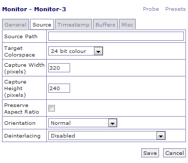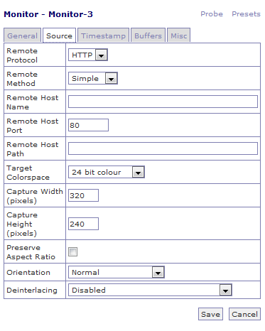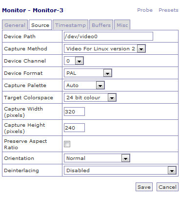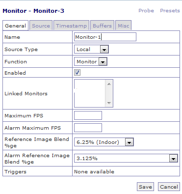 Ahora, para añadir cámaras IP y crear nuestro CCTV particular, pinchamos en "Add New Monitor" y nos saldrá una ventana con 5 pestañas. De las cuales, para realizar una configuración básica, sólo hará falta modificar ciertos datos de las dos primeras pestañas: "General" y "Source". Sólo comentaré los campos imprescindibles, ya que las opciones de todos los campos son innumerables. Si deseas investigar más a fondo, no dudes en pasarte por la Documentación de Zoneminder.