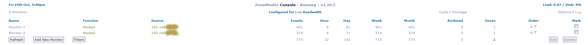 Una vez configurado todo lo anterior correctamente, nos debe aparecer en la página principal de Zoneminder nuestra cámara con la IP (o hostname) en verde como en la siguiente figura: